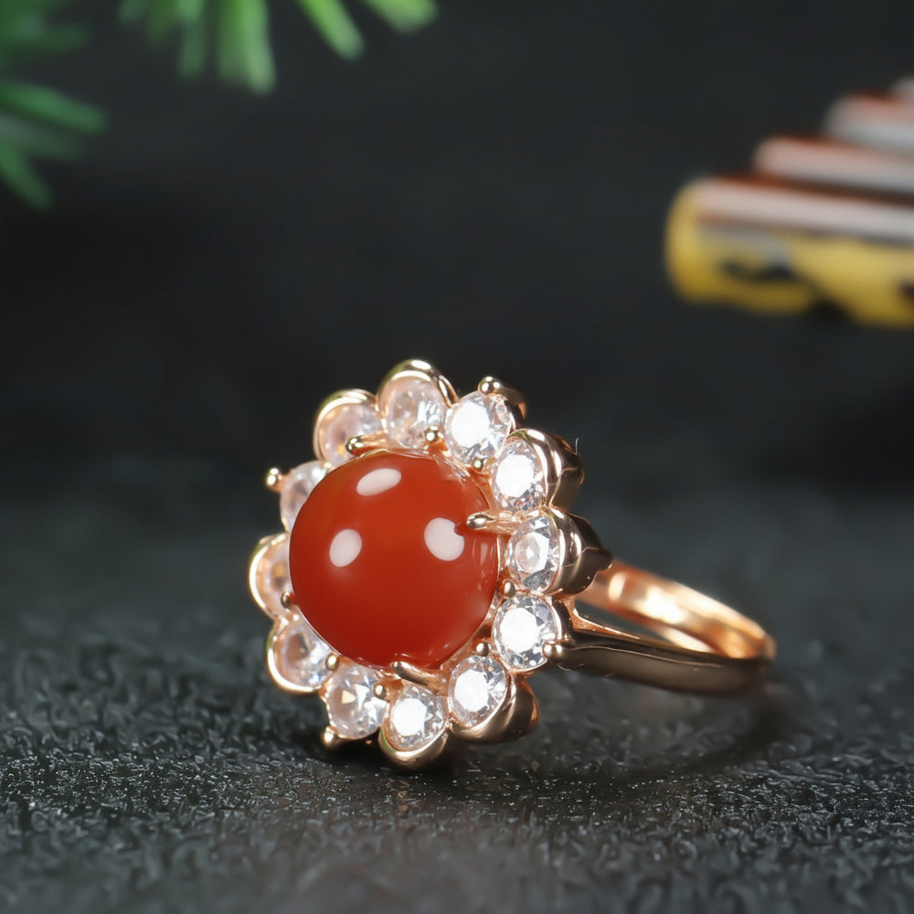 This ring is a profound symbol of Blooming Strength. The central red agate represents the unshakeable core of your being—your life force, passion, and vitality. In many spiritual traditions, red is the color of the root chakra, the energy center that grounds us to the earth and provides a foundation of security and stability. This stone is a bastion of strength, protecting your energy field from negativity and helping you stay centered in your power.