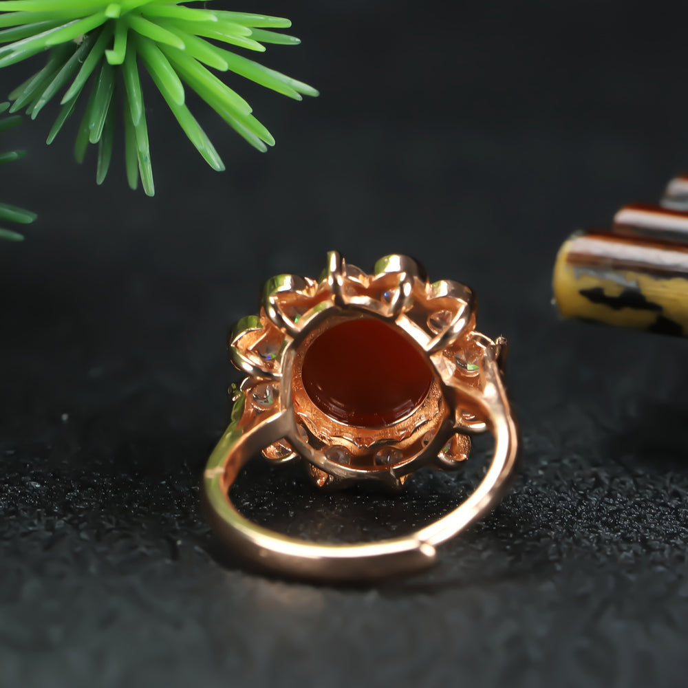 Embrace timeless elegance and powerful energy with our Elegant Red Agate Adjustable Ring. This exquisite piece features a stunning oval-cut natural red agate, celebrated for its vibrant life-force energy. The central stone is embraced by a delicate halo of sparkling cubic zirconia, arranged in a beautiful floral design that symbolizes growth and beauty. Crafted in a warm, rose gold-plated setting, this adjustable ring is designed to fit comfortably, making it a perfect daily talisman for strength, passion, and spiritual protection.
