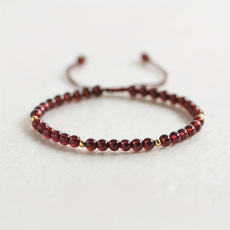 This minimalist red garnet bracelet features hand-braided natural stone beads with golden accents, creating a harmonious blend of elegance and positive energy. Each bead is carefully selected for its unique energy properties and aesthetic appeal.
