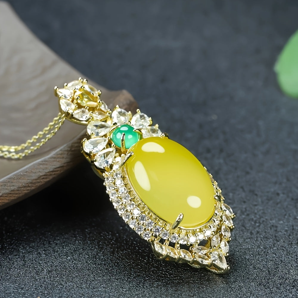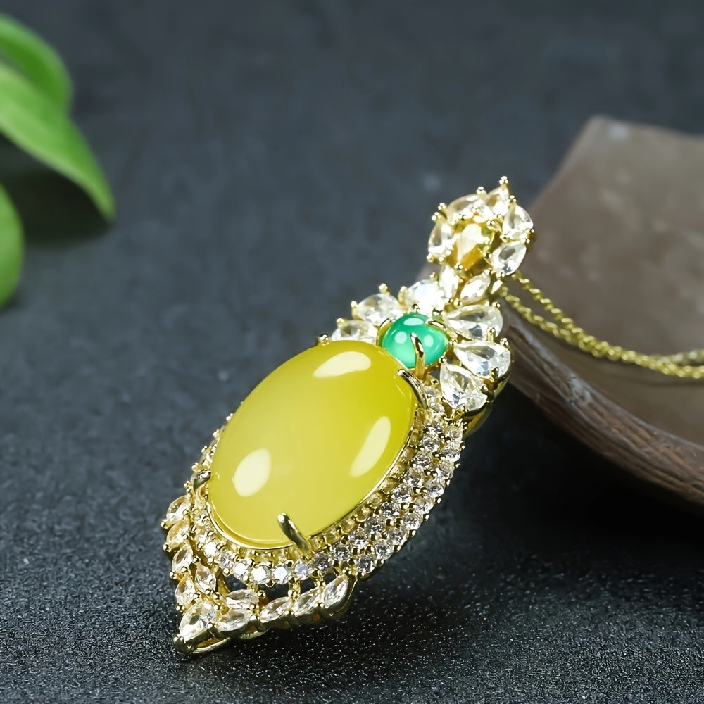 Elevate your style with our Elegant Retro Oval Chicken Oil Yellow Jade Necklace—a timeless piece that blends vintage charm, energetic benefits, and versatile design. Featuring an oval chicken oil yellow jade pendant (2.5cm width, 6cm height) inlaid with sparkling cubic zirconia (clear and green accents) and a 46cm gold-tone chain, this necklace is designed for women who value both fashion and well-being. The retro-inspired design and grounding energy make it perfect for casual outings, formal events, or everyday wear.
