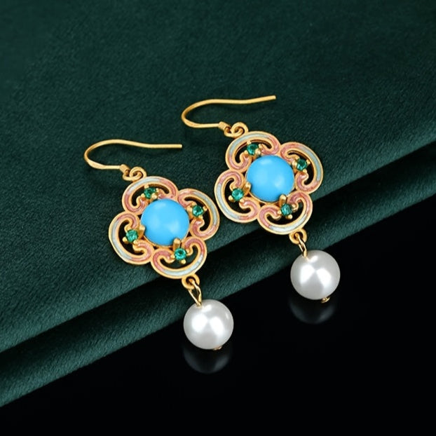 These elegant vintage four-leaf clover earrings feature a design inspired by the lucky four-leaf clover, with blue beads, faux emeralds, and imitation pearls. The golden accents add a touch of luxury, while the blue and green hues represent harmony and renewal.