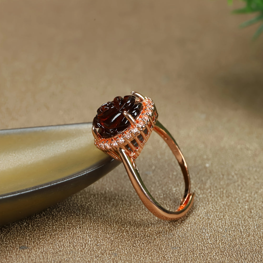 The ring's deep red agate and warm rose gold tones capture the essence of love and vitality. With an adjustable band for a perfect fit, this ring combines vintage charm with profound energetic properties, making it a unique and meaningful addition to any jewelry collection.