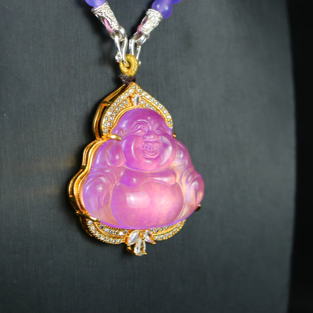 The natural violet stone possesses unique color variations that testify to its earth-born authenticity, with each subtle hue shift telling a story of geological formation. The gold-tone metal setting provides a warm, radiant frame that enhances the stone's natural beauty while symbolizing prosperity and divine connection.