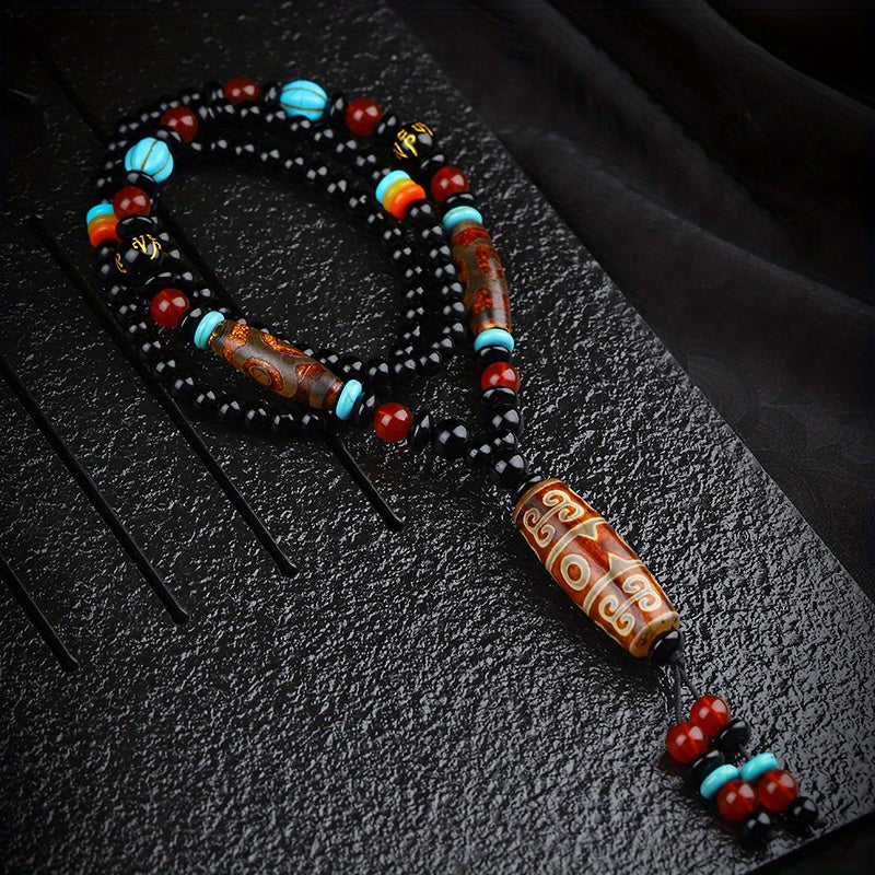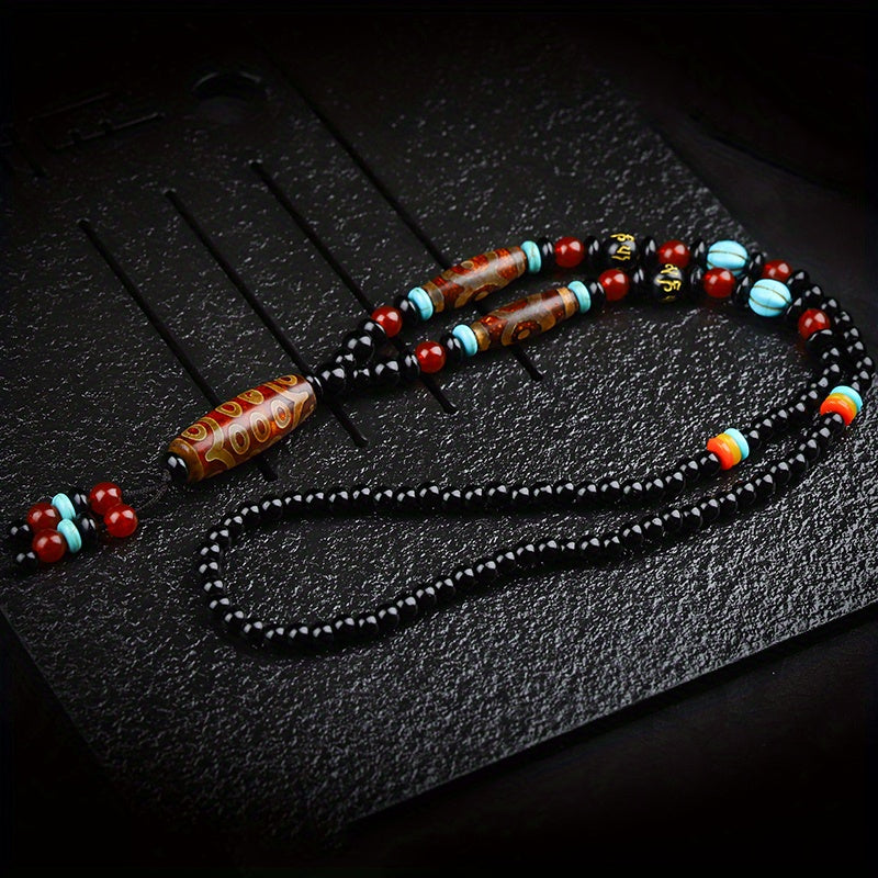 This handcrafted bohemian pendant necklace features deep charcoal-black beads (likely onyx or obsidian) paired with turquoise-teal and carnelian red accents, centered around a striking Dzi-esque natural stone pendant. The design radiates ethnic Chinese-Tibetan style with spiritual resonance—grounding, emotional balance, and vibrant energy in one wearable talisman.