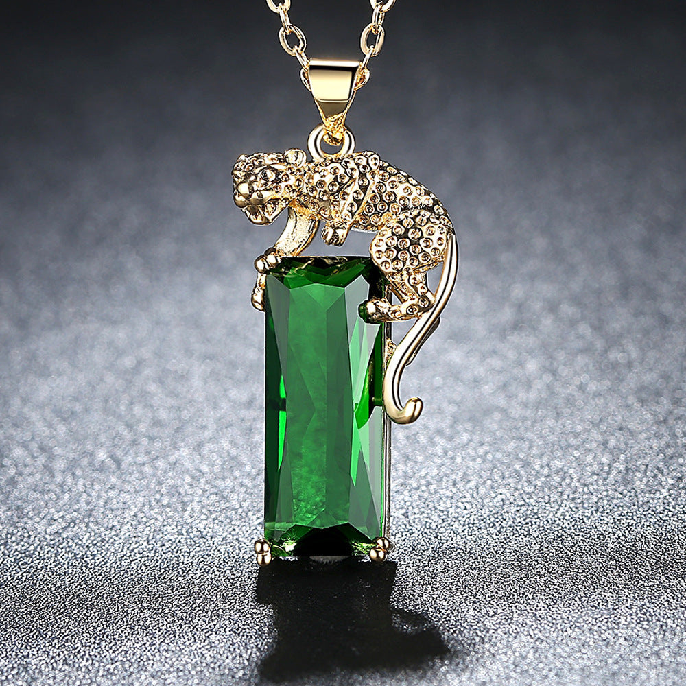 This exquisite leopard pendant features a golden-tone chain with intricate wildlife design and green glass inlay. The combination of gold and green creates an elegant look perfect for daily wear or special occasions.