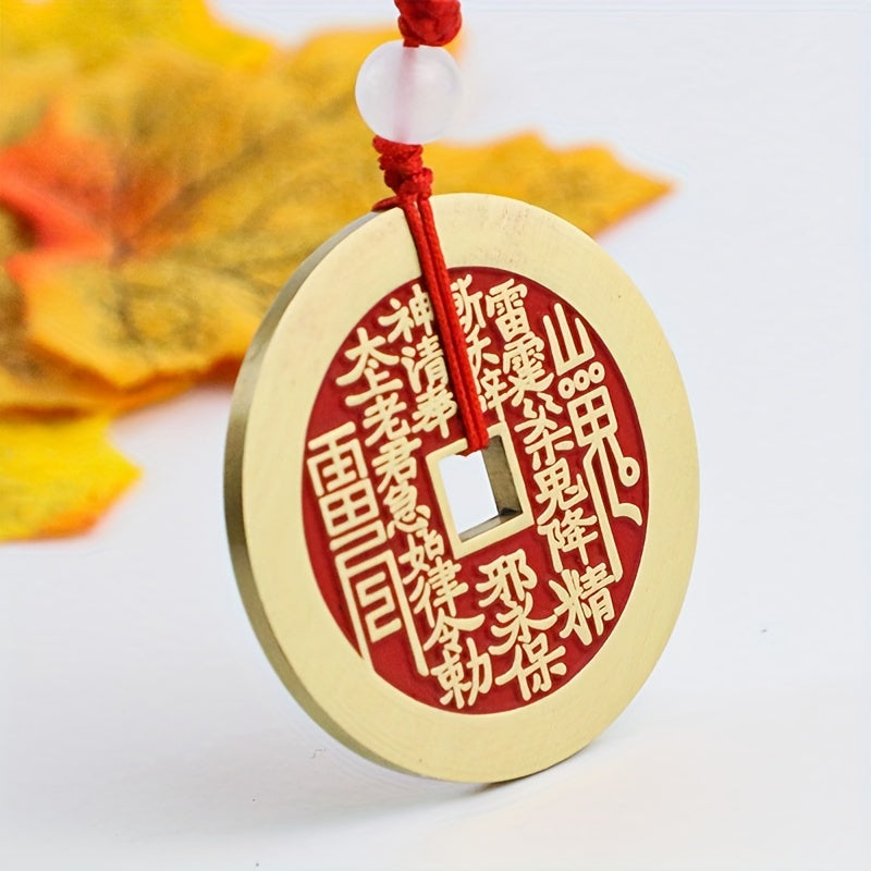 This authentic Chinese Feng Shui coin necklace features an ancient copper coin design with cinnabar-colored inscriptions. Measuring 2.7cm (1.06 inches) in diameter, this talisman combines traditional wealth symbolism with yin-yang energy balancing properties. The coin features auspicious Chinese characters believed to attract good fortune, while its circular shape represents heavenly energy and spiritual completeness. Wear this amulet as a protective charm, prosperity attractor, and spiritual harmony enhancer.
