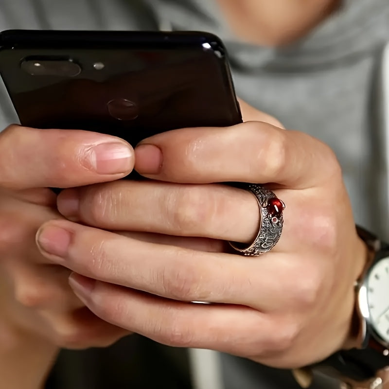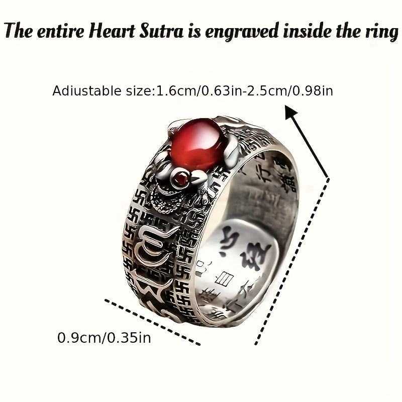 This Feng Shui Pixiu ring combines authentic symbolism with modern craftsmanship. The silver-gray alloy base features a detailed Pi Xiu carving with red gemstone accent, representing wealth attraction and protection. The Heart Sutra engraving on the inner band provides daily mindfulness and spiritual protection.