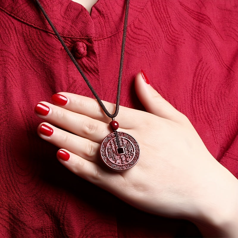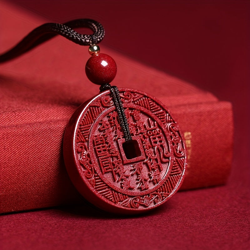 This fidelity cinnabar pendant features intricate mountain ghost carvings and five emperors money beads on a black woven cord. The ethnic style design combines spiritual symbolism with stylish aesthetics, making it perfect for daily wear or special occasions.