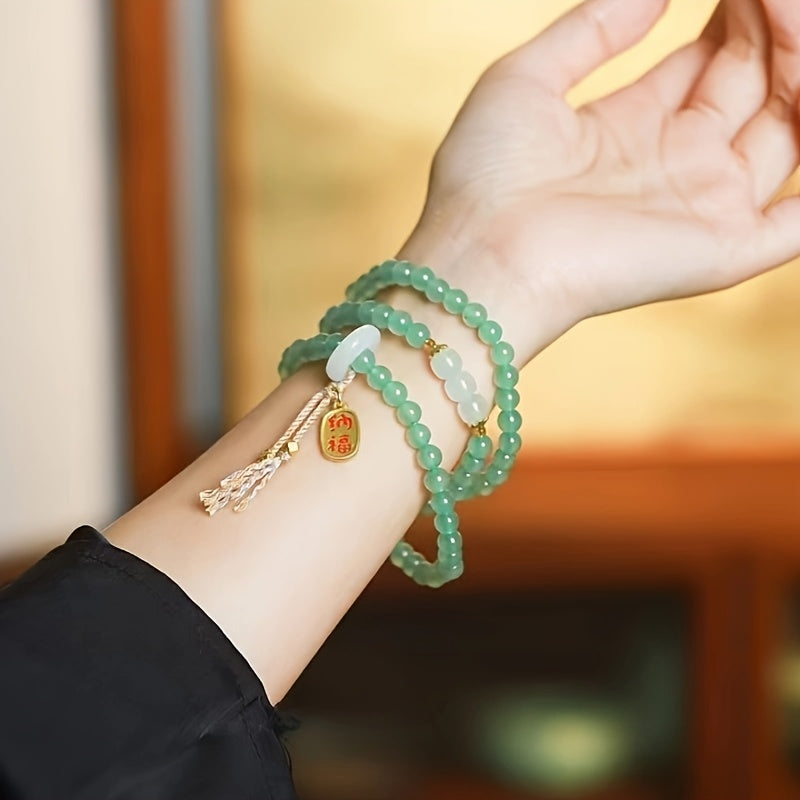 Elevate your style with our Fortune Bag Multi-Ring Retro Natural Stone Bracelet—a timeless piece that blends national style, symbolic meaning, and calming energy. Featuring multi-ring green natural stone beads, white jade-like accents, a red focal bead, and a "Fortune Bag" charm with a lotus tassel, this bracelet is designed for women who value both fashion and well-being. The gold-plated accents add a touch of elegance, while the tassel infuses playful tradition.