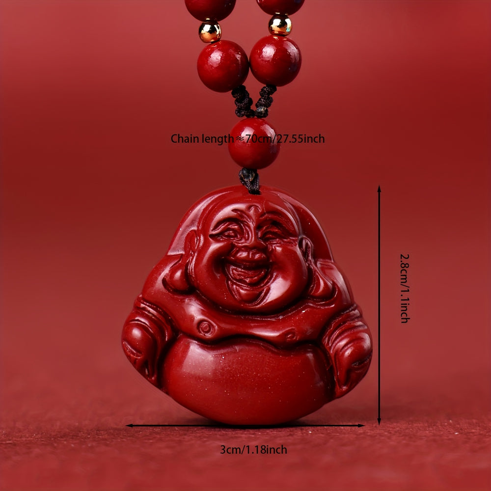 The necklace features a red cinnabar stone Buddha pendant with red sandalwood beads, creating a harmonious blend of colors and energies. The red cinnabar stone symbolizes energy, vitality, and protective power, while the smiling Buddha represents happiness, contentment, and spiritual fulfillment. The red sandalwood beads enhance grounding and stability, making this necklace a powerful symbol of balance and well-being.