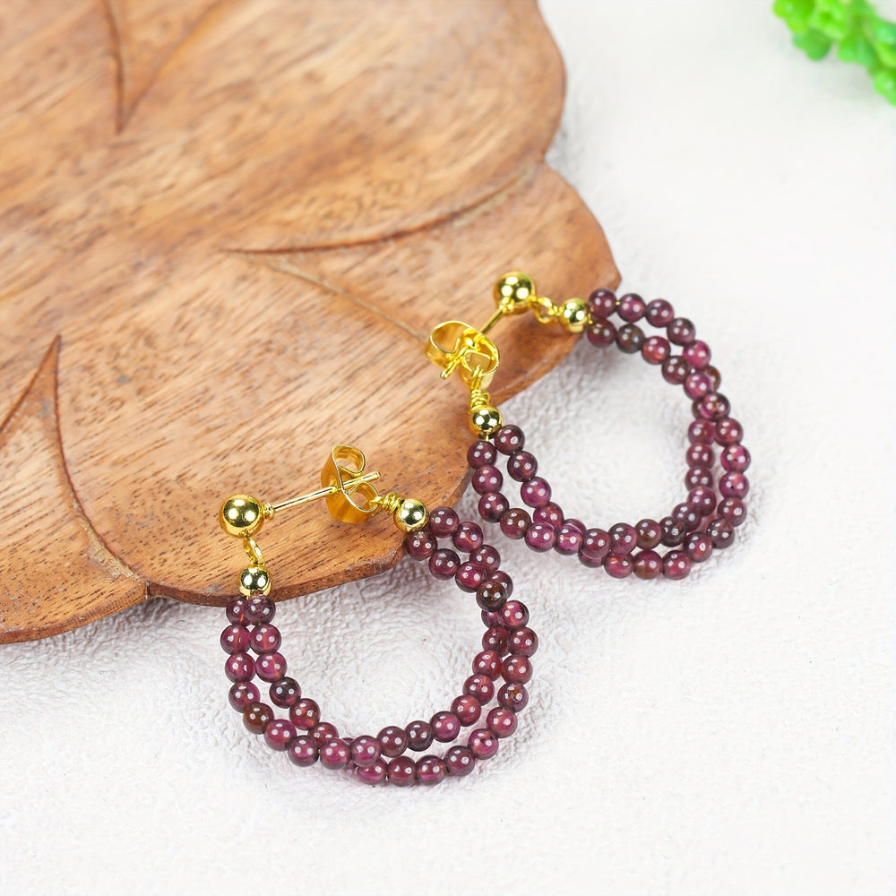 This natural garnet earrings features grape shape design with smooth, lustrous beads in deep red tones. The combination of garnet and golden alloy creates an elegant look perfect for daily wear or special occasions.