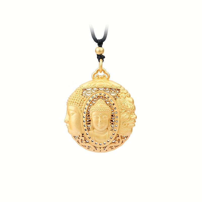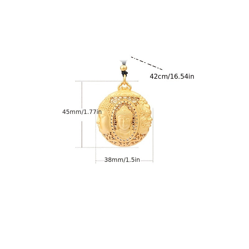 This gold-plated triple Buddha pendant necklace embodies spiritual harmony and protection through its intricate carvings of three Buddhas. The 45mm copper-crafted pendant features Shakyamuni, Amitabha, and Medicine Buddha, symbolizing wisdom, longevity, and enlightenment.