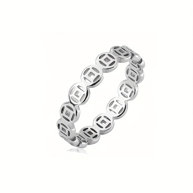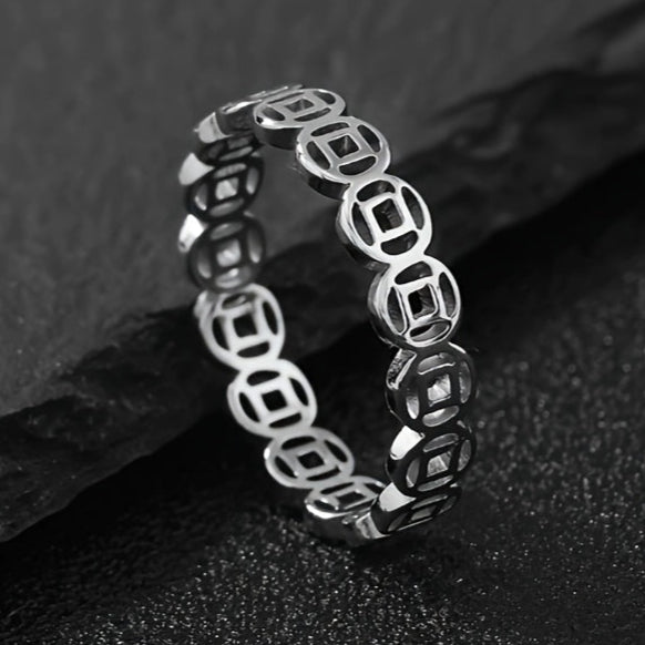 The copper money symbol represents prosperity and financial success in feng shui practices, making this ring both a fashionable accessory and a meaningful prosperity talisman.