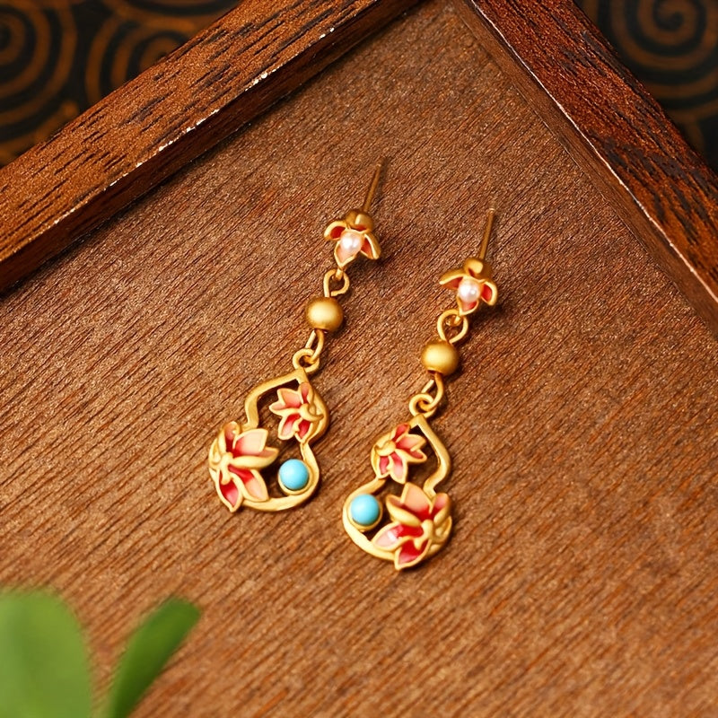 These golden floral gourd earrings feature golden-plated floral gourd charms with turquoise accents. The 39mm height and floral gourd design create an elegant look perfect for festive occasions or casual elegance.