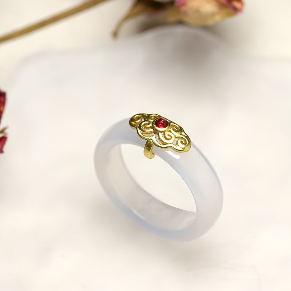 The green jade represents balance and harmony, while the red gemstone symbolizes passion and vitality. The golden accents enhance protection and prosperity, making this ring a powerful tool for attracting positive energy and supporting spiritual connections.