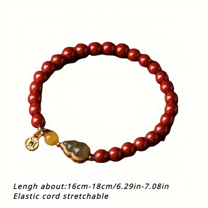 This bracelet embodies ancient Chinese spiritual traditions. The gourd shape (葫芦 húlú) symbolizes abundance, health, and protection from evil spirits. Cinnabar red is the most auspicious color in Chinese culture, representing joy, luck, and vitality. The gold-tone charm enhances prosperity energy. Together, these elements create a powerful talisman for attracting wealth while protecting against negative influences. The elastic design symbolizes adaptability and the fluid nature of fortune.