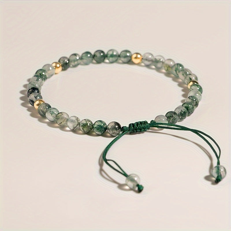 This handwoven bracelet features natural green agate beads woven with durable thread in an adjustable design. Each stone is carefully selected for its unique energy properties and aesthetic appeal, creating a powerful tool for energy healing and mindful living.