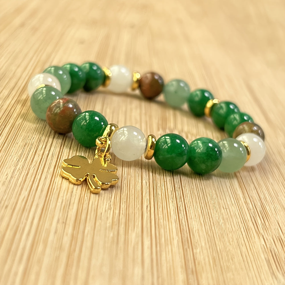The Four-Leaf Clover symbolizes luck and protection, while Green Aventurine enhances opportunity and Chrysocolla promotes emotional balance. This makes the bracelet ideal for meditation and daily wear.