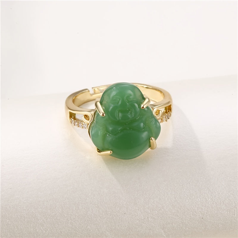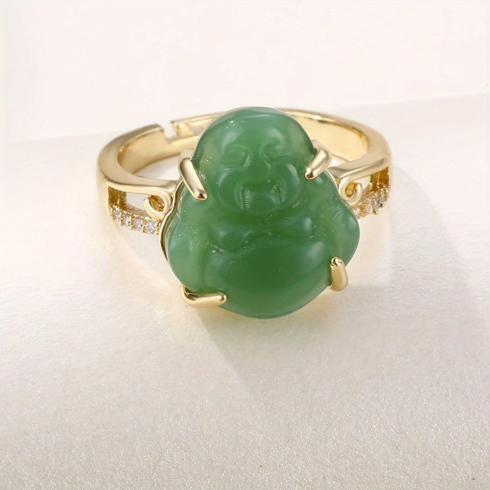 This green jade and gold ring features a synthetic zirconia design with spiritual symbolism. The combination of gold accents and green hues creates an elegant look perfect for parties or special occasions.