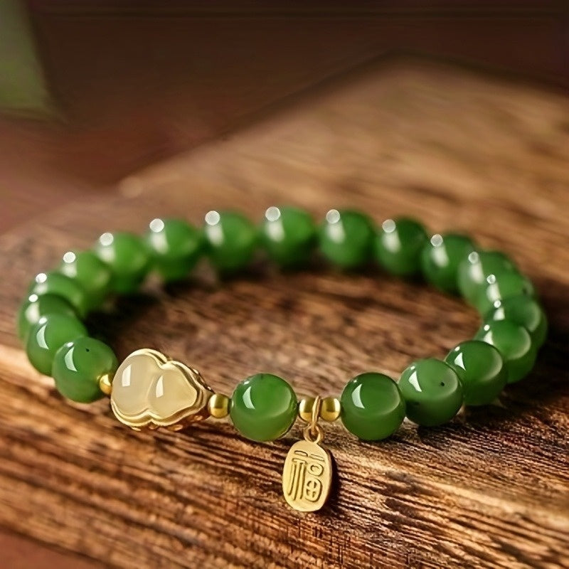 The vibrant green jade symbolizes harmony, balance, and protection in many cultural traditions. It resonates with the Heart Chakra, promoting love, compassion, and emotional healing. The gold accents represent prosperity, success, and spiritual illumination. The auspicious symbol charm enhances spiritual connection and attracts positive opportunities, while the "Fu" pendant invites good fortune and abundance into your life.