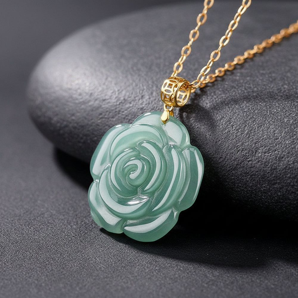 This necklace is a beautiful convergence of natural earth energy and profound symbolic meaning. The Rose is one of the most powerful and ancient symbols in human culture, representing love, beauty, passion, and the unfolding of the soul. Its petals unfolding are a metaphor for spiritual awakening and the opening of the heart. When carved into Light Blue Jade, its meaning is deepened and amplified.