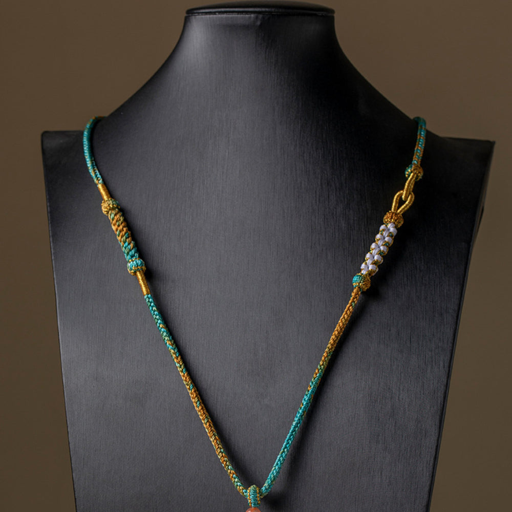 This peach blossom knot necklace features hand-woven polyester rope in blue-green and gold-brown tones with a peach blossom knot pendant. The combination creates an elegant look perfect for daily wear or special occasions, embodying the essence of retro Chinese style.