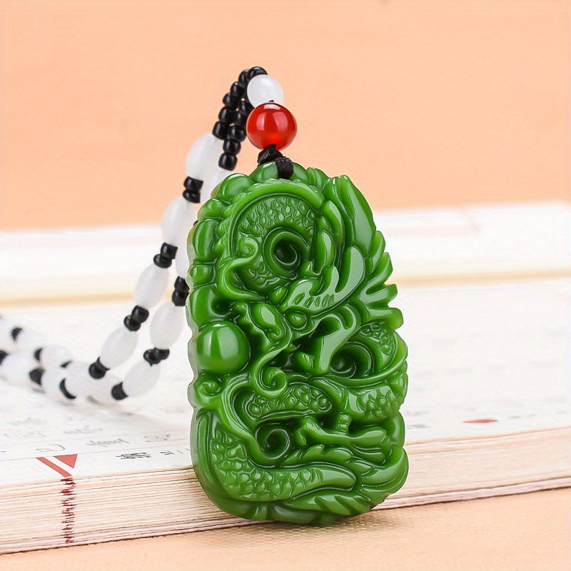 “This handcrafted green jade dragon pendant necklace combines natural energy with fashionable charm. The dragon motif symbolizes strength and prosperity, while the green jade promotes healing and abundance.”