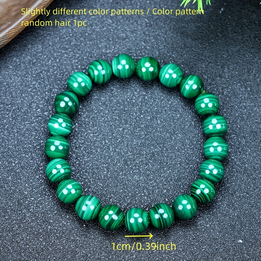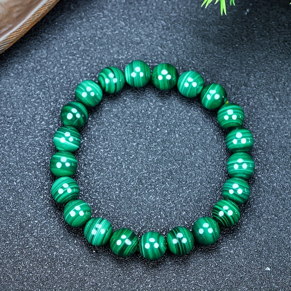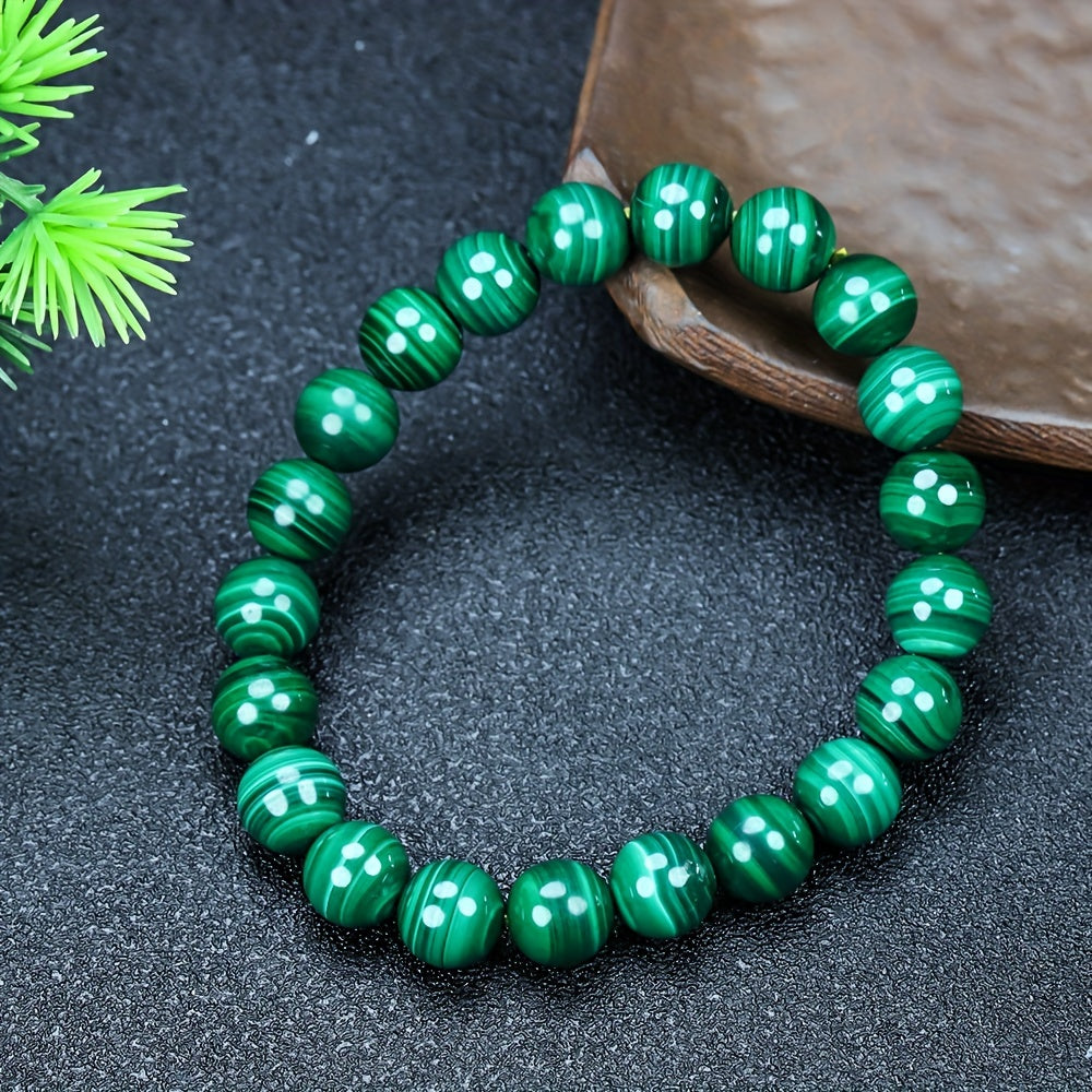 Each bead showcases the unique, banded pattern that makes malachite so captivating. The rich, deep green color is a direct reflection of its powerful connection to the heart and the earth. Worn as a bracelet, it keeps the stone's energy in constant contact with your skin, allowing its healing properties to flow directly into your aura, promoting balance, protection, and positive change.