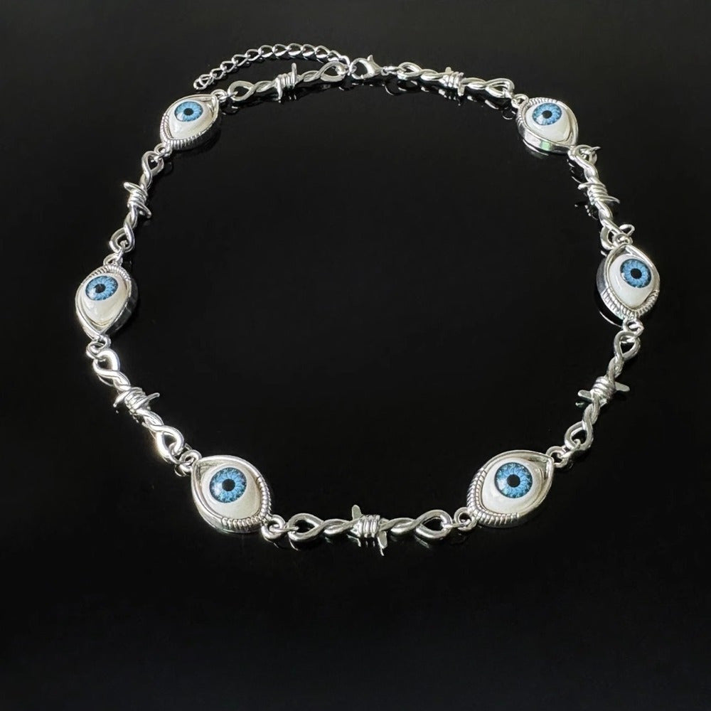 This Heavy-Duty Exaggerated Collarbone Chain features an edgy layered design with intricate eye pendants in vibrant blue. The combination of silver and blue creates an elegant accessory perfect for gothic fashion and everyday wear.