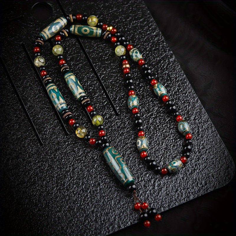 This retro-style agate bead necklace features authentic tibetan dzi bead patterns in deep green, rich red, and black agate beads. With a total length of 68cm (26.77 inches), this necklace combines ancient spiritual symbolism with modern ethnic fashion. The unique patterns on the dzi beads are believed to offer spiritual protection, energy harmony, and vitality enhancement, making it not just jewelry but a meaningful talisman for daily wear.