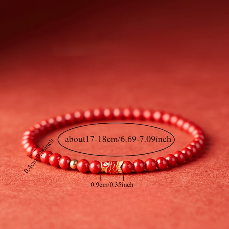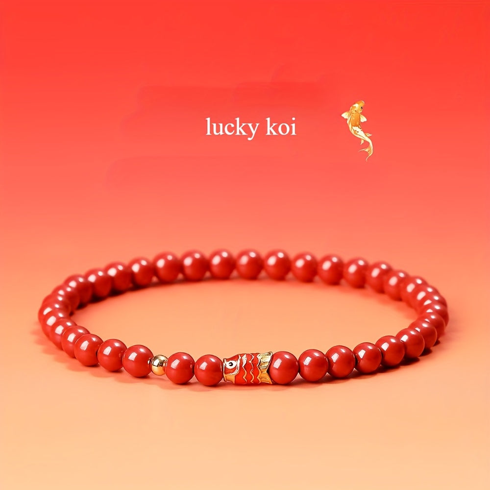 The cinnabar beads represent protection and good fortune in traditional symbolism, while the golden koi fish symbolizes perseverance and success. The elastic rope design ensures a comfortable fit for daily wear, making it perfect for those seeking both style and energetic support.