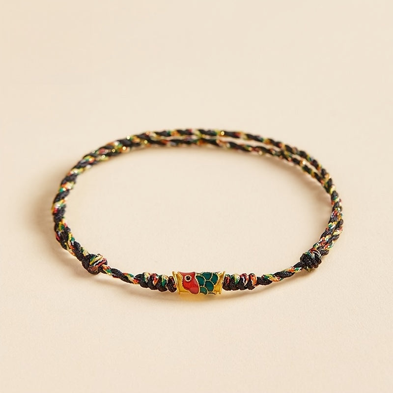 This handmade bracelet features a colorful braided nylon string with a central gold-plated fish charm inlaid with vibrant enamel. The fish motif is an ancient symbol of abundance, freedom, and good fortune. Its adjustable size (15–24 cm / 5.9–9.4 in) makes it suitable for men, women, and teens alike. Wear it daily as a protective talisman and a reminder of resilience, flow, and prosperity.