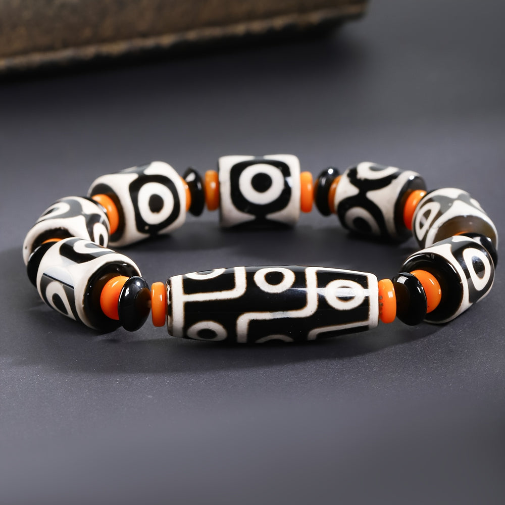 This Bohemian Agate Bracelet features large 9-hole agate beads with vibrant orange and black geometric patterns. The combination of natural stone textures and bold colors creates a striking ethnic style accessory perfect for daily wear, parties, and gifts.