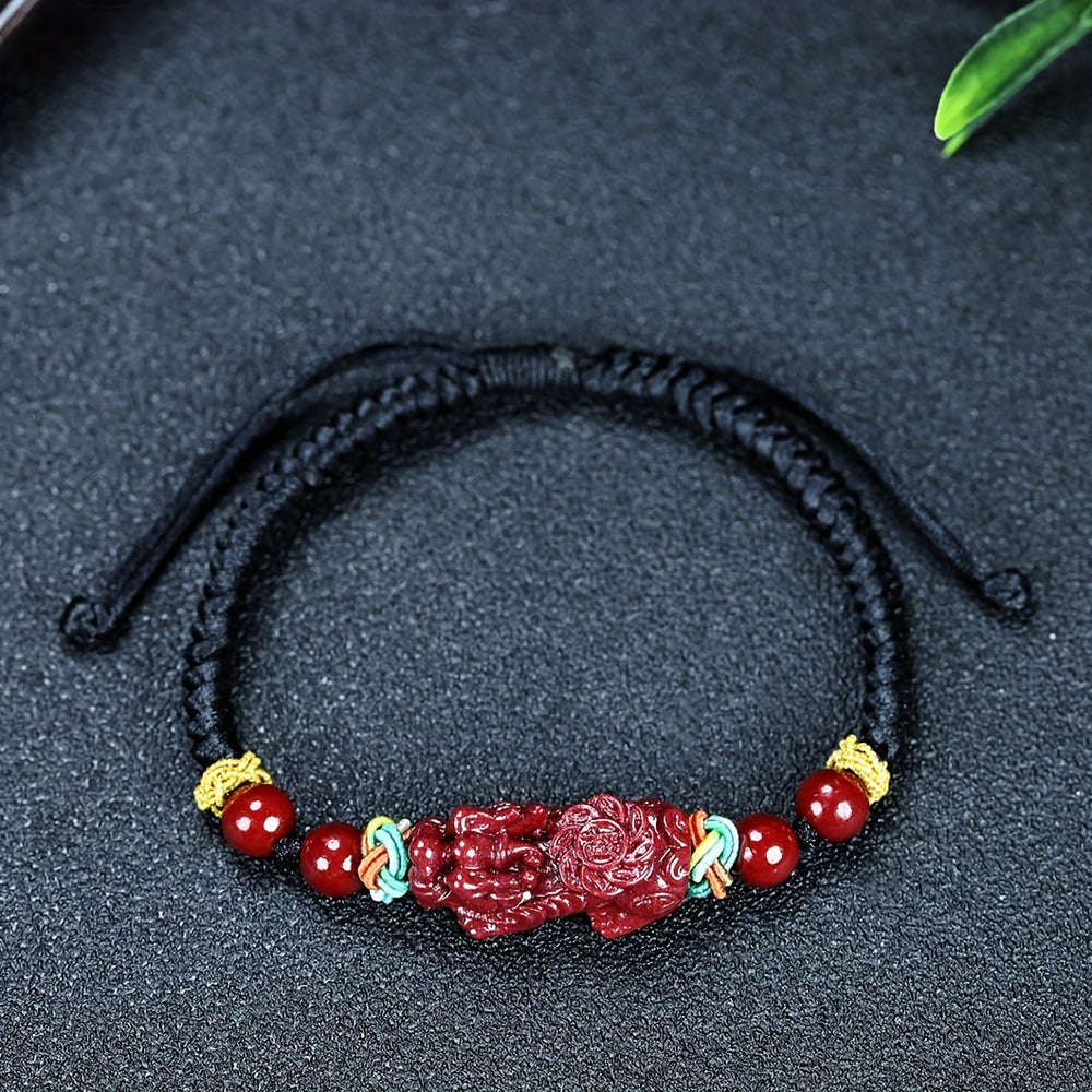 This cinnabar beads bracelet features a hand-carved Pixiu charm with emperor sand ruyi patterns in vibrant red cord. The combination of black woven rope and colorful beads creates an elegant look perfect for daily wear or special occasions.