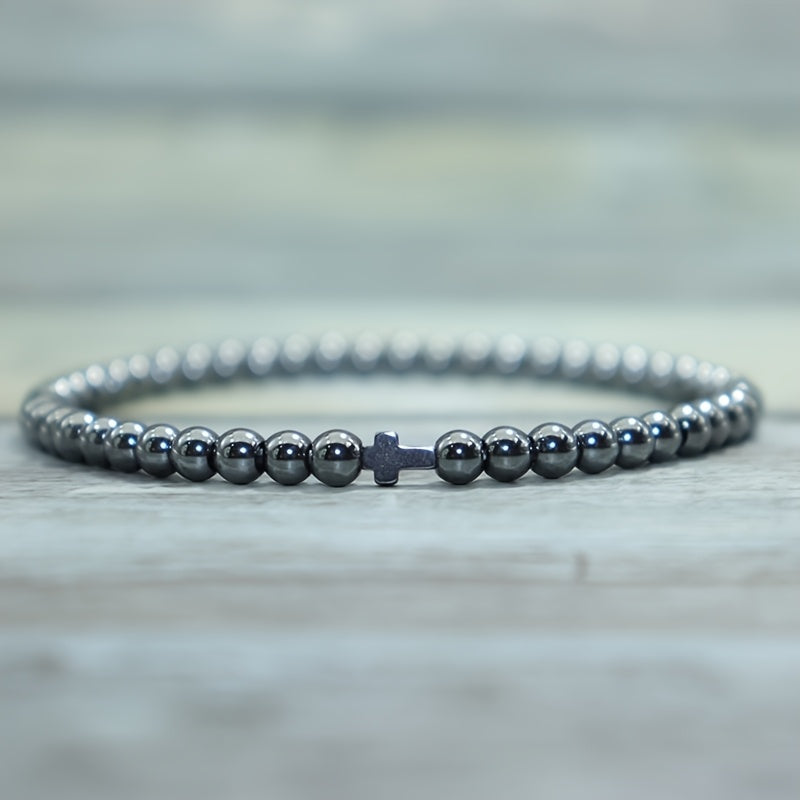 This men's bracelet combines 4mm blue stone beads with a 6mm black cross charm in a handcrafted design. Perfect for daily wear, parties, and as a meaningful gift, it promotes spiritual protection and harmony through its calming blue hues and symbolic cross charm.