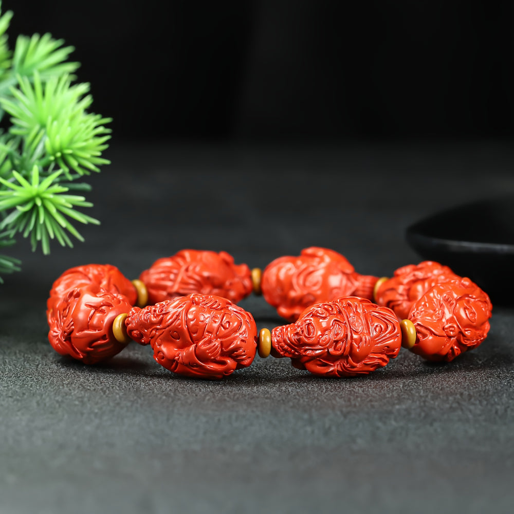 This bracelet is a profound fusion of ancient belief and powerful energetics. The central theme is the Wealth God (Caishen), a principal deity in Chinese folklore revered for his ability to bestow prosperity and good fortune upon mortals. Each bead is a miniature shrine to this powerful figure, creating a continuous stream of blessings and opportunities for the wearer. The choice of Red Cinnabar as the medium is critically important, as it is considered the ultimate material for wealth talismans.