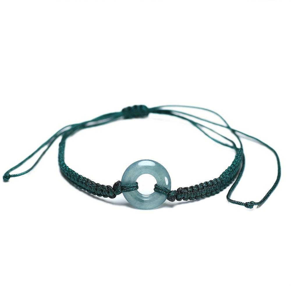 The adjustable rope design ensures a comfortable fit for all wrist sizes, while the natural stone textures provide grounding energy properties. The deep green hue represents growth and renewal, while the light blue-gray tones promote calm and clarity.