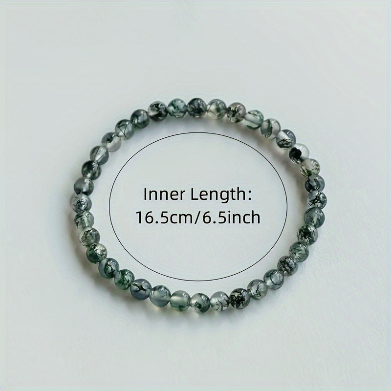 This moss agate beaded stretch bracelet features authentic 3mm beads with natural green hues and gray-white accents. The elastic design ensures comfortable daily wear while promoting energy balance and spiritual harmony.