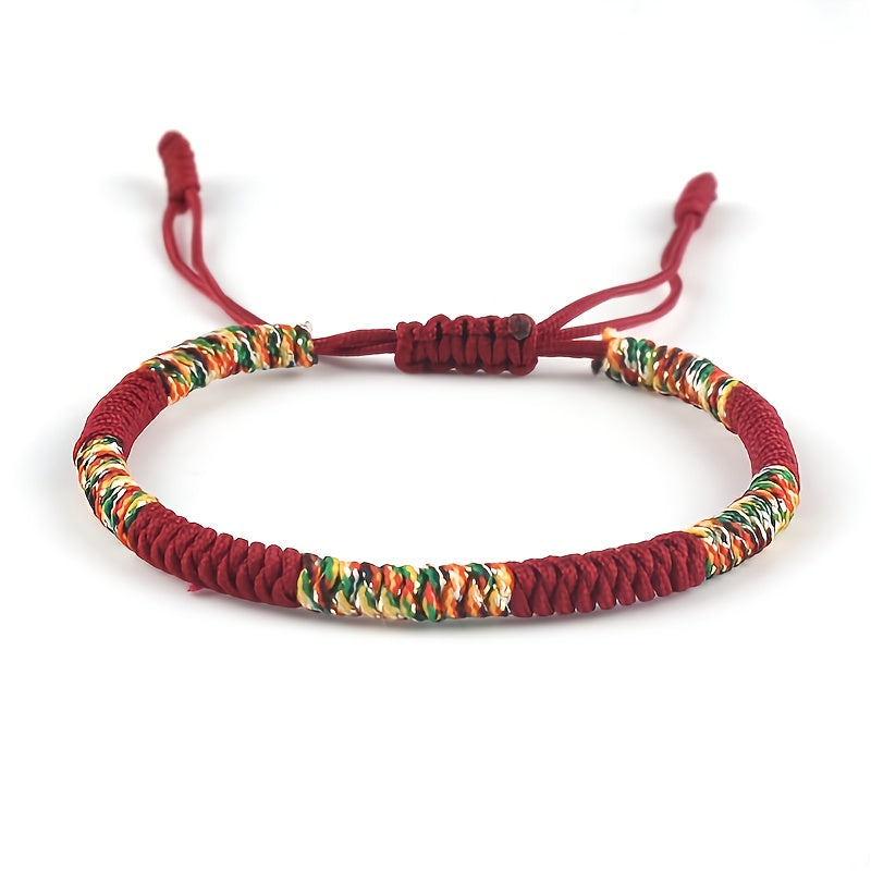 This multicolor knitted bracelet features vibrant red cords with colorful stripes, creating a lively and energetic look perfect for daily wear. The ethnic style design combines traditional craftsmanship with modern aesthetics, making it both a fashion statement and a meaningful symbolic accessory.