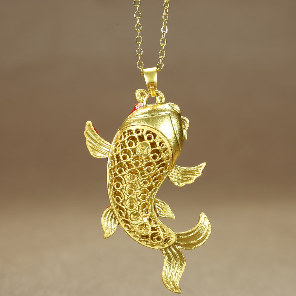 The koi fish represents perseverance, transformation, and success in spiritual symbolism. The jumping over the dragon gate motif symbolizes overcoming challenges and achieving great heights, making this necklace a powerful tool for attracting positive transformation and prosperity energy.