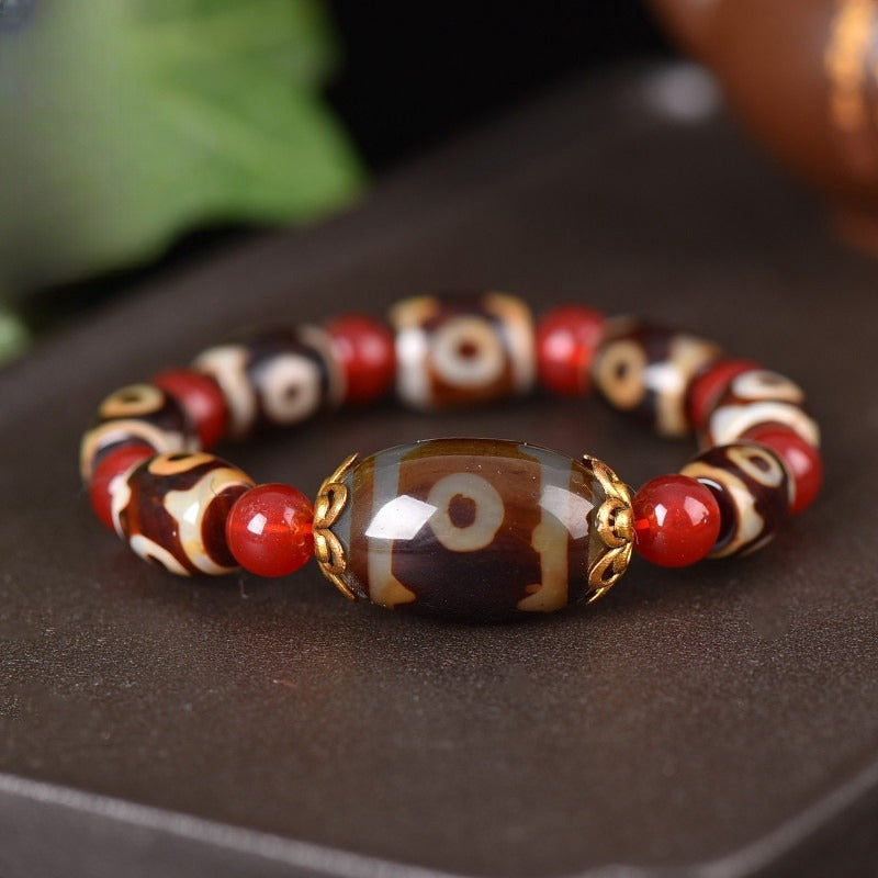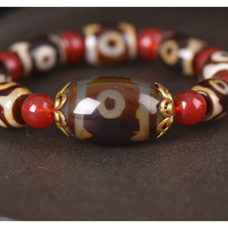 The agate eye bead symbolizes divine protection, clarity of vision, and spiritual insight. The golden accents represent prosperity and positive energy flow, creating a harmonious balance of protection and abundance.