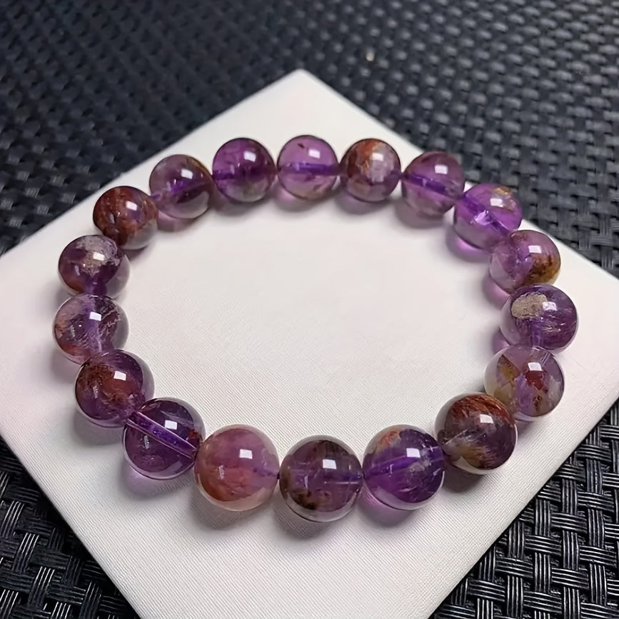 This natural crystal titanium halo bracelet features 6/8/10mm smooth round beads in purplish-brown hue with golden accents. The 16.5cm elastic stretch fit ensures comfortable daily wear for all wrist sizes.