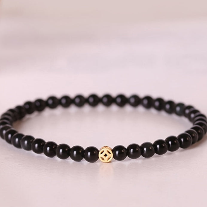 The black obsidian represents protection and grounding in spiritual practices, creating a shield against negative energies while promoting spiritual clarity. The 14K gold charm symbolizes wealth attraction and prosperity, making this bracelet a powerful tool for both protection and financial success.