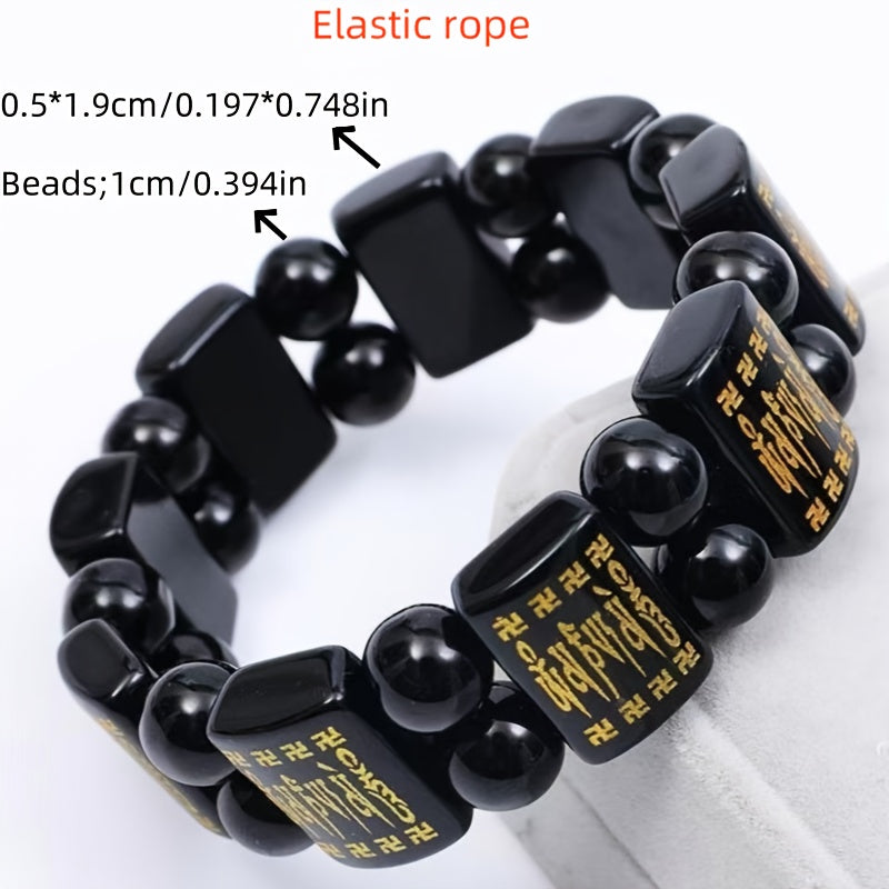 A sleek strand of natural black obsidian rounds is interspaced with curved mantra tablets printed in luminous gold with the Six-Syllable True Word (Om Mani Padme Hum). Strung on a durable elastic rope, this bracelet sits comfortably on the wrist for everyday protection, grounding clarity, and subtle wealth-drawing energy.