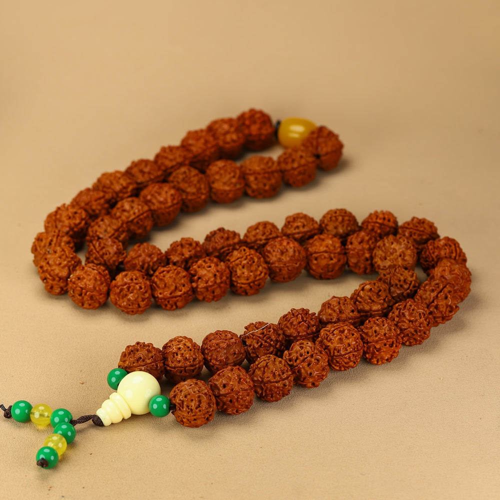 This necklace features authentic Rudraksha beads (approx. 15.1 mm each), complemented by jade-green and ivory-toned accent beads. Traditionally revered in Hindu and Buddhist practice, Rudraksha beads are believed to enhance spiritual protection, inner peace, and meditative focus. The necklace is both a statement of natural beauty and a powerful energy talisman for daily life.