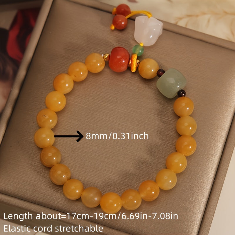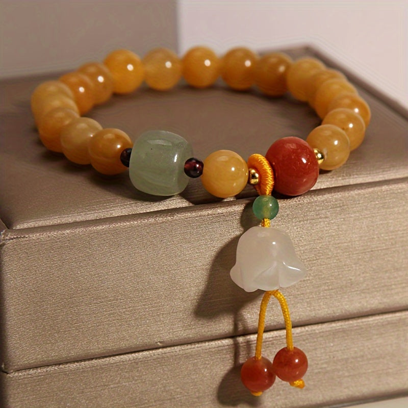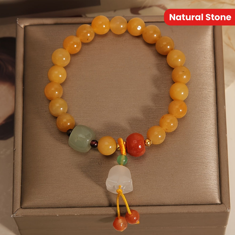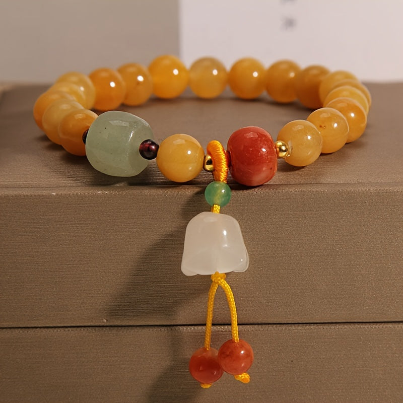 This exquisite bracelet features 8mm natural yellow jade beads, complemented with a green aventurine cube, a red agate accent, and a delicate white jade Campanula pendant. Handcrafted with care, it symbolizes harmony, positivity, and spiritual growth. Its warm golden tones radiate joy and abundance, making it an ideal accessory for both daily wear and meditation practice.Discover the Natural Yellow Jade Bracelet with Campanula pendant – handcrafted with 8mm natural stone beads. Promotes positivity, emotional balance, and spiritual protection. Perfect for daily wear, meditation, and energy alignment.,Natural Yellow Jade Energy Bracelet with Campanula Pendant – Harmony, Protection & Spiritual Healing ,Natural Stone Bracelet, Campanula Pendant Decoration, Natural Yellow Natural Stone Bracelet, Daily Wear, Holiday Gifts.