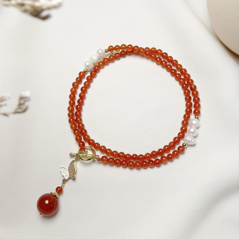 The orange agate represents vitality and creative energy, while the white pearls symbolize purity and wisdom. The golden accents embody wealth and confidence, creating a harmonious balance for couples seeking spiritual connection.
