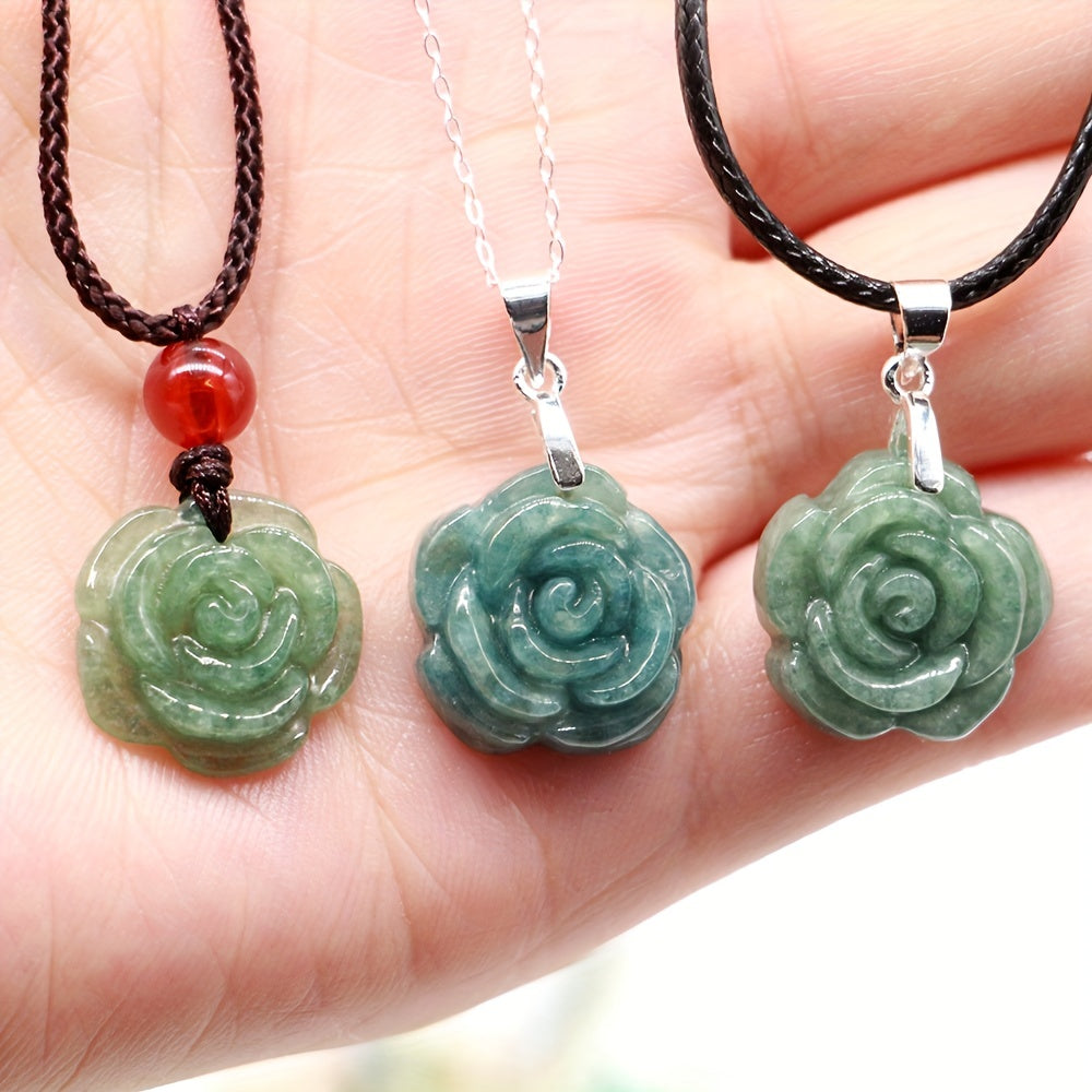 “The handcrafted carved rose motifs and jade create a unique and elegant pendant that stands out in any jewelry collection.”