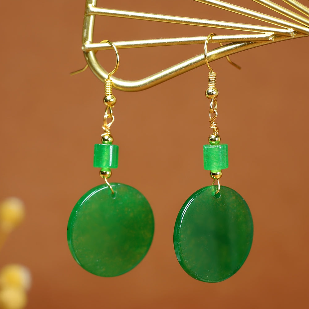 The green gemstone dangle represents growth, renewal, and balance in Chinese culture, while the golden-tone metal adds a touch of luxury and spiritual connection. This makes them both a fashionable accessory and a meaningful harmony symbolism talisman for mindful living.