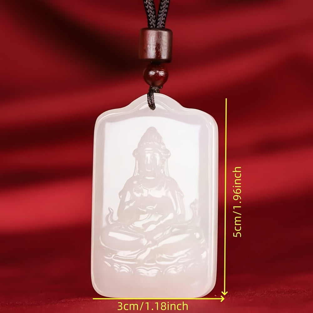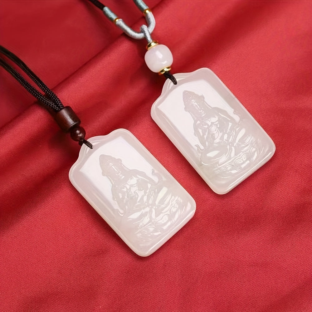 The "Sheep Fat White" Jade is a precious material, celebrated for its pure, opaque quality and gentle, greasy luster. In crystal healing, it is a stone of purity, serenity, and wisdom, believed to attract good fortune and ward off negativity. The figure of Guanyin is one of the most revered deities in Mahayana Buddhism, known as the Bodhisattva of Compassion. Wearing her image is said to invoke her protective and merciful qualities, soothing the soul and guiding one on a path of kindness.